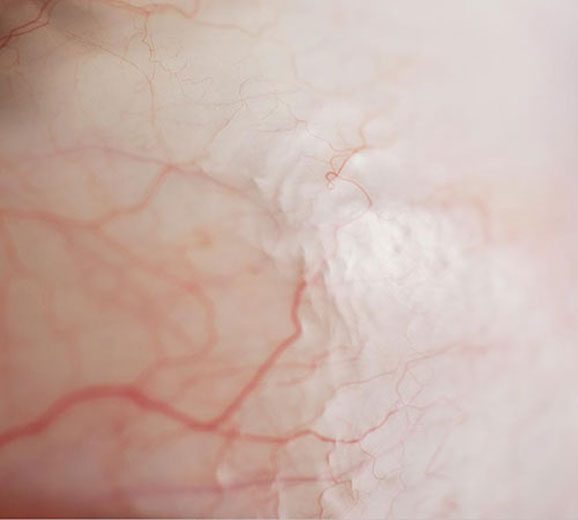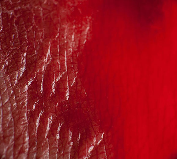 The photographs in this series were printed on oversized glossy paper for a lustrous, almost wet appearance. The image here shows an installation of early experiments. Viewers were given slices of mango and grapefruit to taste while viewing.